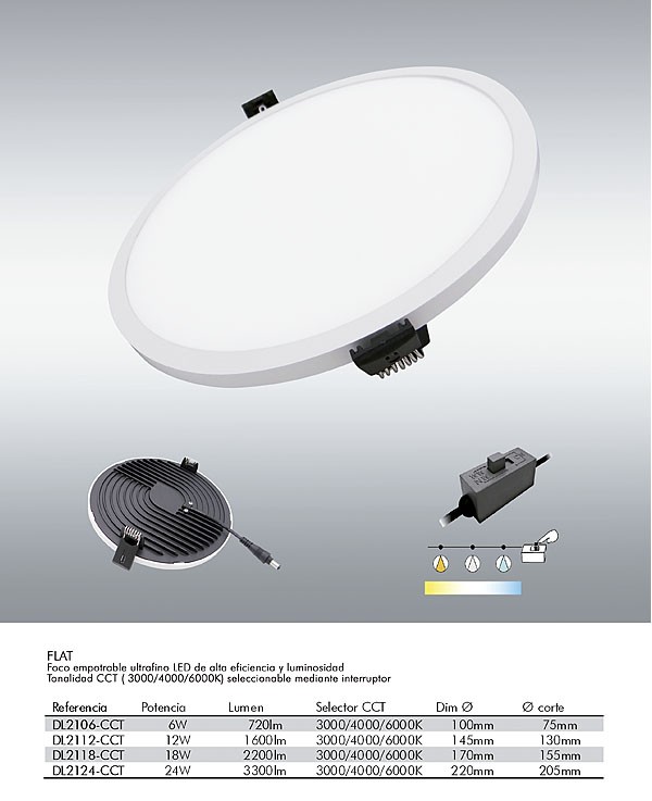 Downlight empotrable ultrafino LED de alta eficiencia y luminosidad para uso profesional y domĆ©stico.Ā EstĆ” realizado en Metal/Metacrilato con acabado en blanco. Posee tecnologĆa de Led Integrado con 12W de potencia con un flujo de 1600 lĆŗmenes. Tonalidad CCT (3000K-4000K-6000K) seleccionable mediante interruptor. Sus dimensiones son Ć145 x Ć130mm(DiĆ”metro x Corte). Producto recomendado para techos con poco o nulo espacio en su interior ya que su espesor es equivalente al de la placa de yeso o de escayola del techo a instalar.
