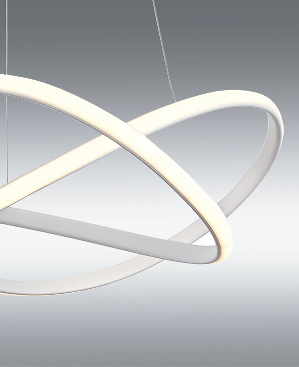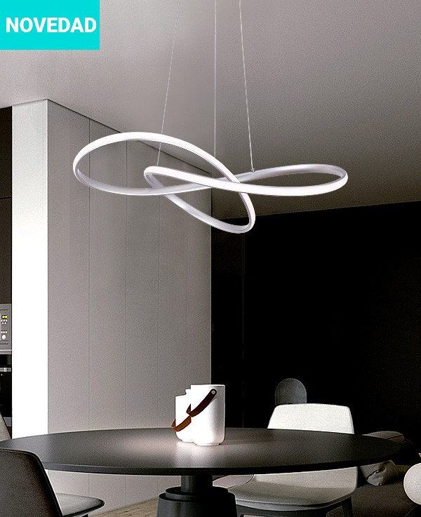 Lámpara colgante Loop con un diseño envolvente y liviano. Su acabado es en pintura blanca. Está realizado en Aluminio con difusor de silicona. Posee tecnología de Led Integrado con 75W de potencia, 5200 lúmenes, mando a distancia con control de intensidad y color CCT variable 4000K-3000K-6000K. Sus dimensiones son Ø60x150 cm (Diámetro x Alto).