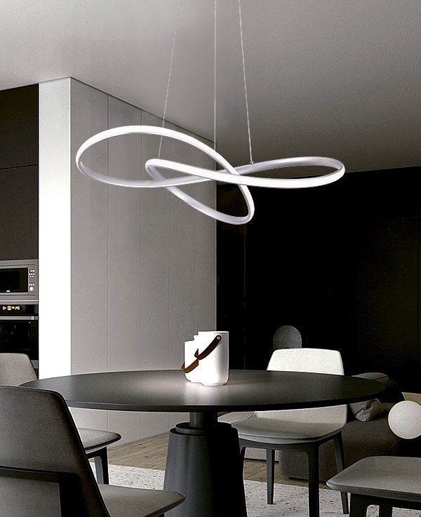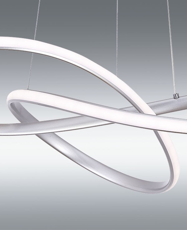 Lámpara colgante Loop con un diseño envolvente y liviano. Su acabado es en pintura plata metalizado. Está realizado en Aluminio con difusor de silicona. Posee tecnología de Led Integrado con 75W de potencia, 5200 lúmenes, mando a distancia con control de intensidad y color CCT variable 4000K-3000K-6000K. Sus dimensiones son Ø60x150 cm (Diámetro x Alto).
