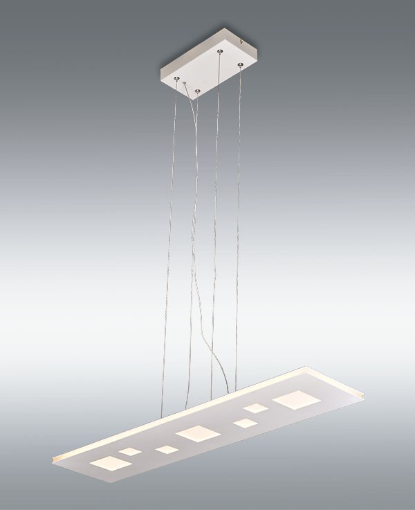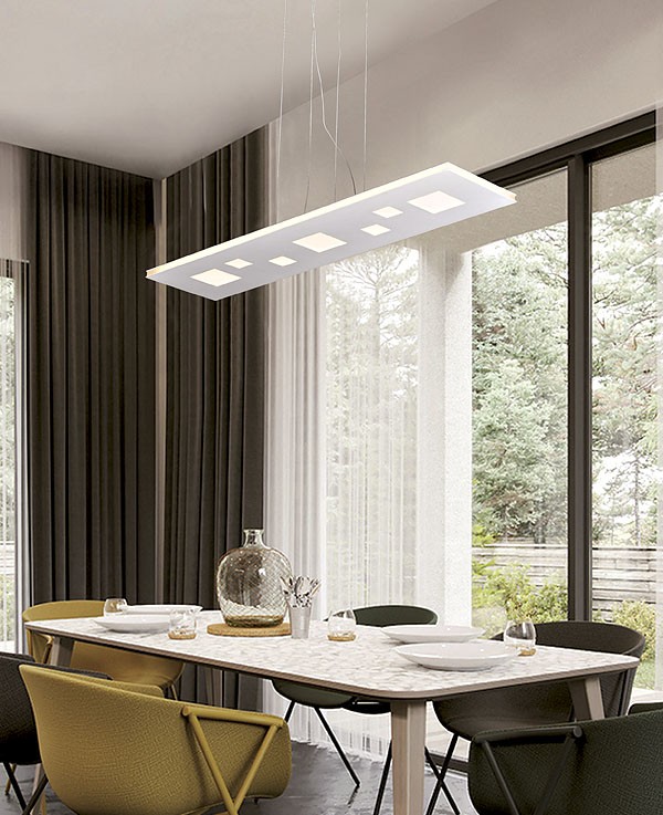 Lámpara colgante Pixel, acabado en Blanco. Está realizado en Metal y el difusor acrílico para la parte frontal y lateral. Posee tecnología de Led Integrado con 36W de potencia, 2900 lúmenes. Dispone de driver regulable triac dimmer con tonalidad 4000K neutro y mando a distancia opcional. Sus dimensiones son 70x17x150 cm (largo x ancho x alto).
