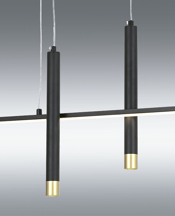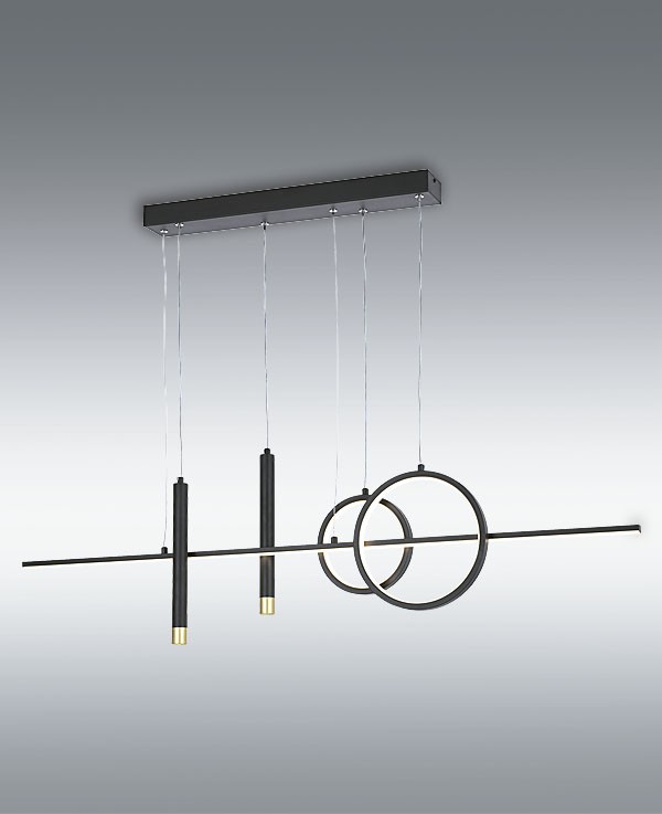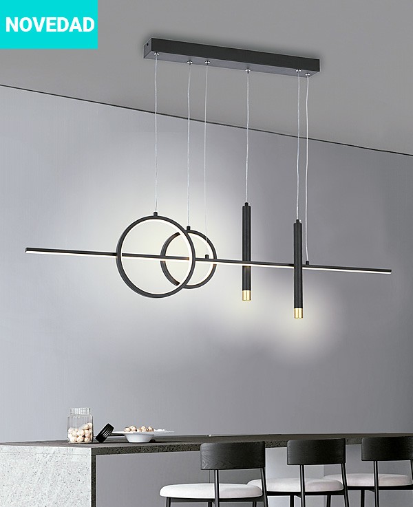 Lámpara colgante Spirit cuyo diseño de carácter lineal está compuesto por dos tubos regulables en altura y dos aros sobre un perfil horizontal. Está fabricado en metal de color negro con detalles en oro metalizado. Posee tecnología de Led Integrado con 67W (36+36) de potencia, 5400 lúmenes, mando a distancia con control de intensidad y color CCT variable 4000K-3000K-6000K. Sus dimensiones son 120x10x150 cm (Largo x Ancho x Alto).