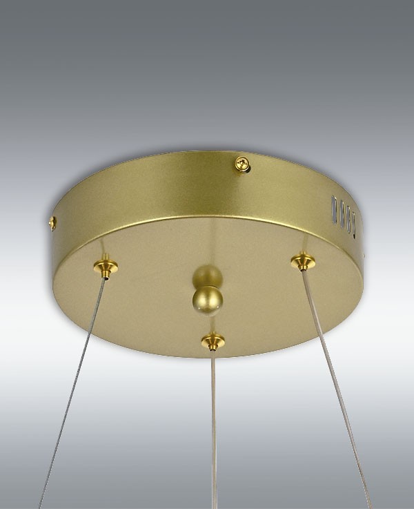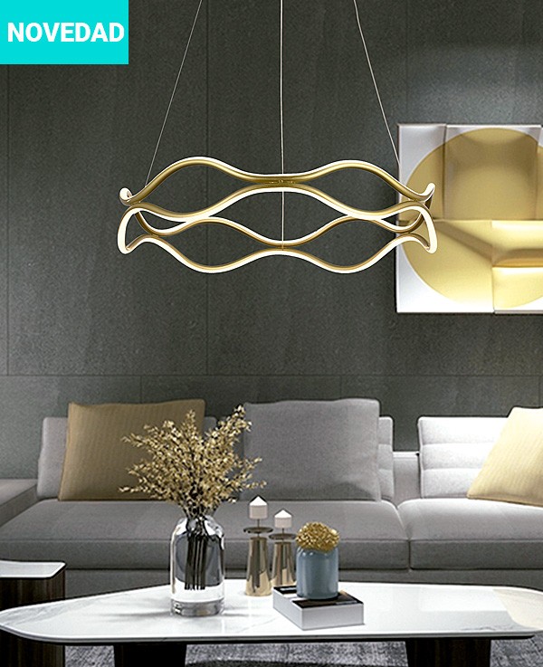 Lámpara colgante LED 140W 11200lm. Mando a distancia control de intensidad y color CCT variable 4000K-3000K-6000K. Acabado oro.