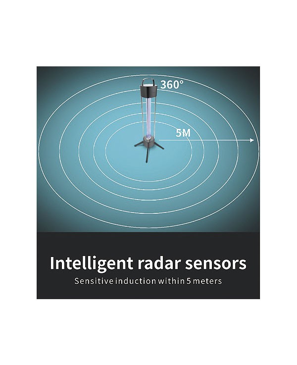 Lámpara profesional UV-C 36W posee un diseño robusto con ángulo de irradiación de  360°. Un Interruptor con retardo, configurado en 30 segundos para asegurar el uso seguro de la lámpara UV-C. Dispone de Sensor radar que detecta movimiento a 5m para interrumpir el proceso de desinfección y proteger a personas y mascotas durante su uso. Interruptor táctil de control.