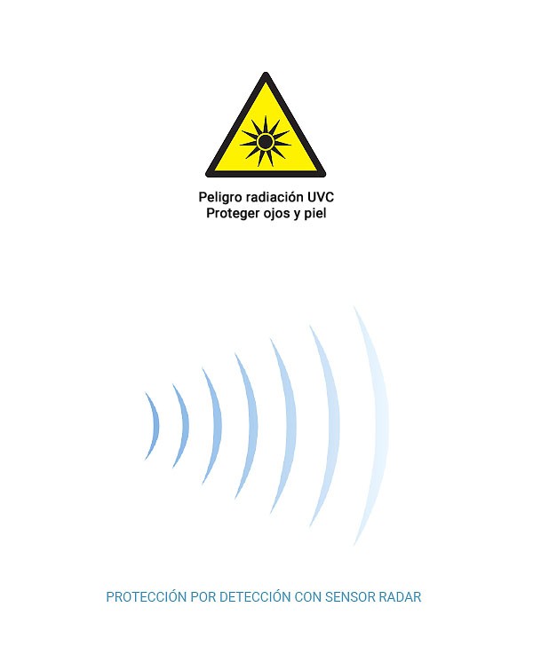 Peligro radiación UVCNo puede haber presentes personas ni animales durante su utilización, aunque tiene sistema de protección radar para detener la radiación se requiere por seguridad proteger ojos con gafas EN170 y la piel cubierta con guantes y ropa opaca.