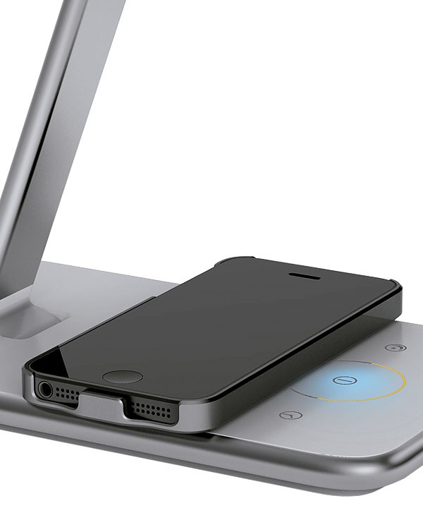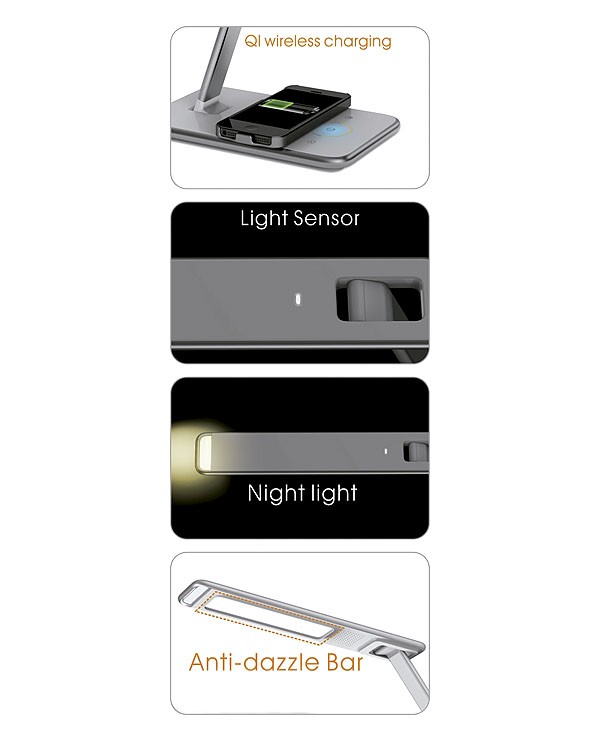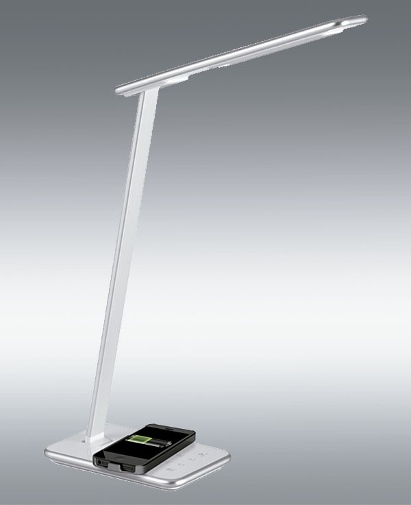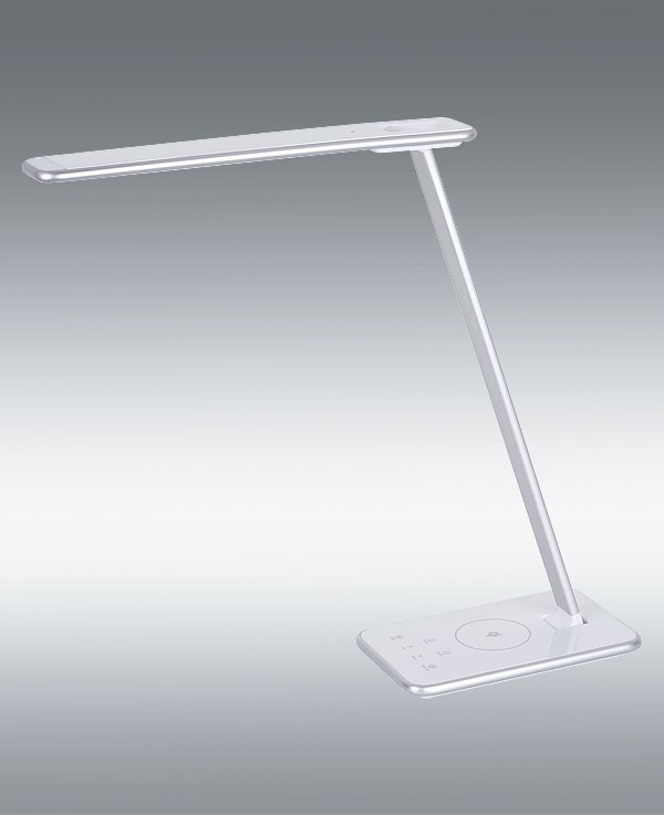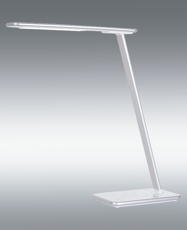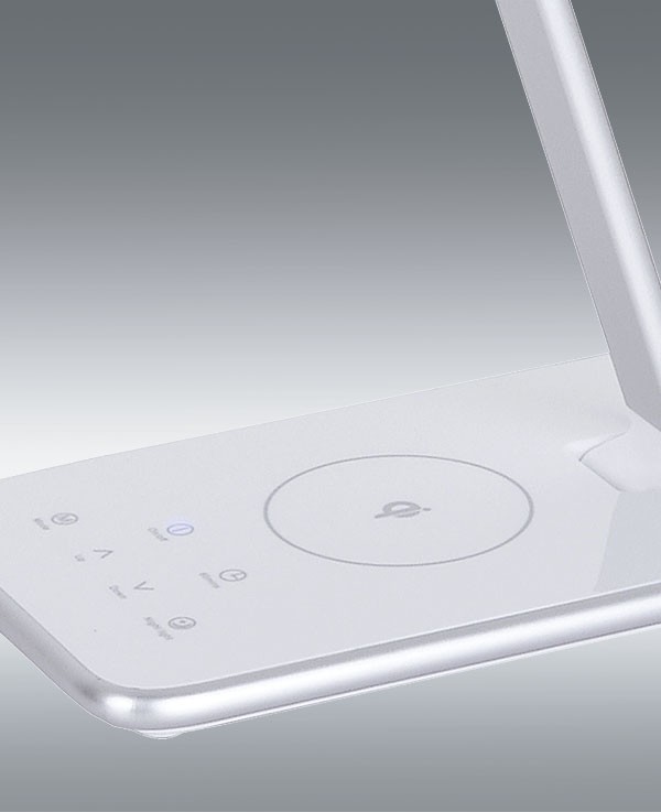 Lampara de mesa LED 10W 700 lm 2800-5700K (3 Modos de color) – Intensidad regulable. Cargador móvil inalámbrico (wireless charger). Cargador USB 1A. Sensor de luz y modo noche. Acabado blanco + aluminio
