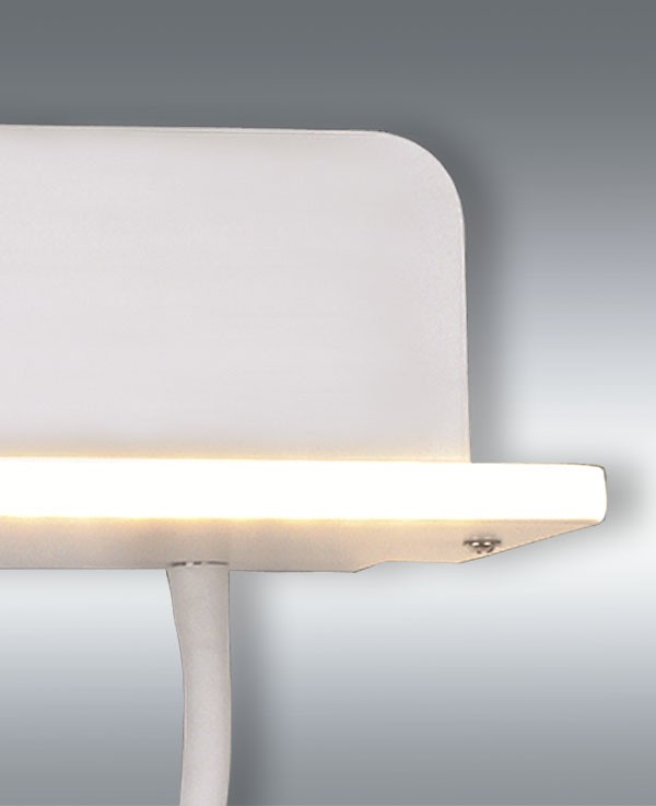 Lámpara de pared/Aplique Mars acabado en Blanco. Está realizado en Metal/Metacrilato. Posee tecnología de Led Integrado con 7W en la bandeja + 3W de potencia en el lector, 450+250 lm lúmenes. Tonalidad 4000K neutro. Sus dimensiones son 28x10x8 cm (largo x ancho x alto). Doble interruptor que permite accionar independientemente cada luz y entrada USB como cargador de dispositivos. Ideal para instalación en cabeceros de dormitorio.