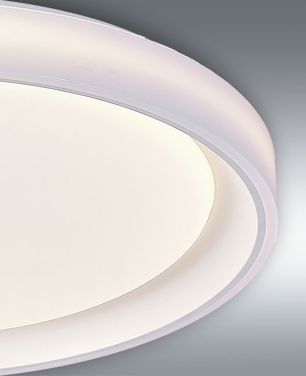 Lámpara plafón de la familia California con un diseño moderno y de calidad. Su acabado es en pintura epoxy blanca. Está realizado en Metal con difusor de policarbonato matizado. Posee tecnología de Led Integrado con 72W de potencia (36W + 36W ), 5700 lúmenes y mando a distancia con control de intensidad y color CCT variable 4000K-3000K-6000K. Sus dimensiones son Ø40x7 cm (Diámetro x Alto). Modelo también disponible en negro y en oro.