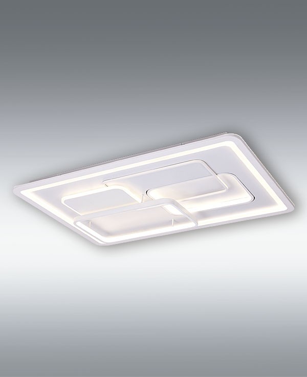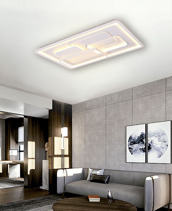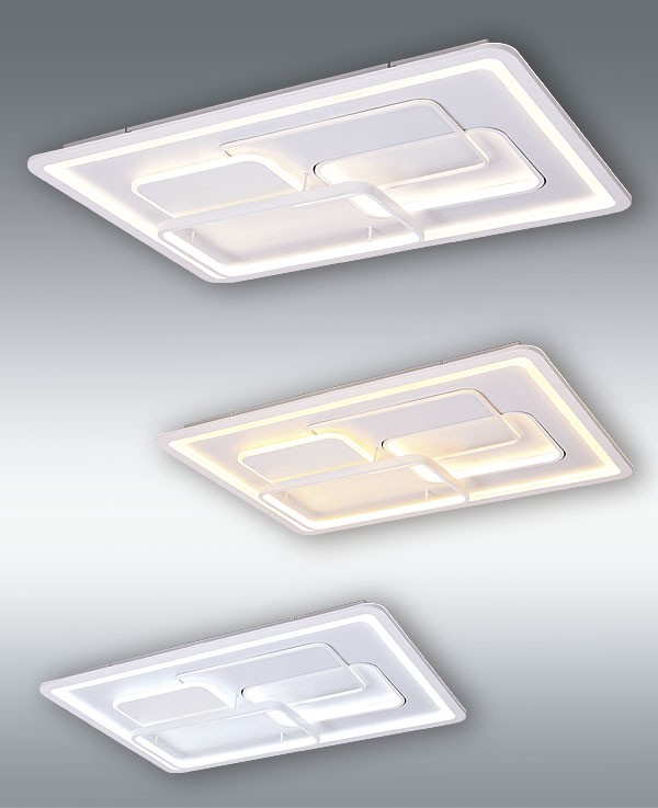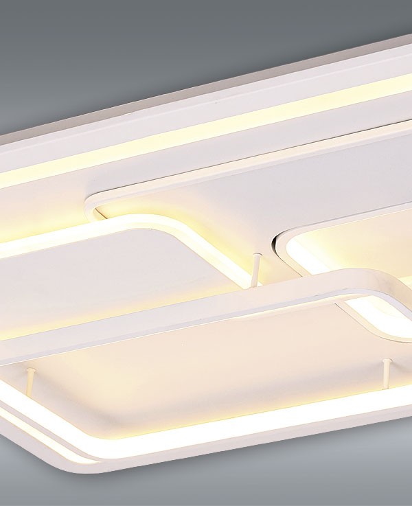 Lámpara plafón de la familia Edén con un diseño rectangular de varios elementos a distintas alturas. Su acabado es en pintura epoxy blanca. Está realizado en Metal con difusor de metacrilato matizado y silicona en uno de sus elementos. Posee tecnología de Led Integrado con 140W de potencia, 9800 lúmenes y mando a distancia con control de intensidad y color CCT variable 3000K-6000K. Sus dimensiones son 90x60x8 cm (Largo x Ancho x Alto).