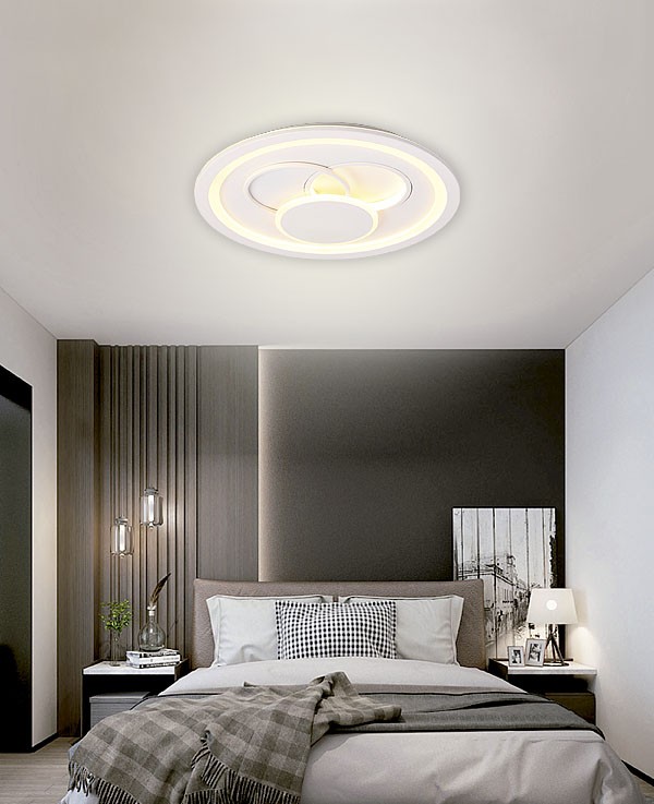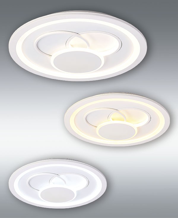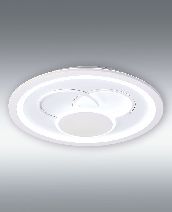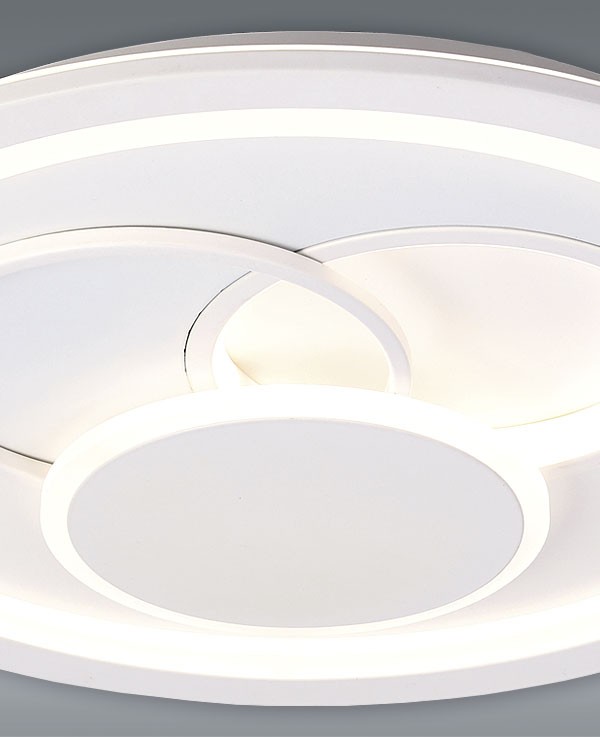 Lámpara plafón de la familia Edén con un diseño basado en aros a tres alturas. Su acabado es en pintura epoxy blanca. Está realizado en Metal con difusor de metacrilato y silicona en su aro interior. Posee tecnología de Led Integrado con 60W de potencia, 4200 lúmenes y mando a distancia con control de intensidad y color CCT variable 4000K-3000K-6000K. Sus dimensiones son Ø50x8 cm (Diámetro x Alto).