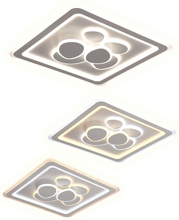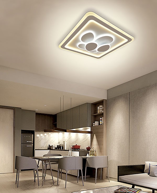 Lámpara plafón Petals de color pan de oro con forma cuadrada. Está realizado en Metal/Metacrilato. Posee tecnología de Led Integrado con 60Wx2 de potencia, 7200 lúmenes y mando a distancia con control de intensidad y color CCT variable 4000K (120W)-3000K (60W)-6000K (60W). Sus dimensiones son 50x50x7 cm (largo x ancho x alto). Con mando incluido. Modelo también disponible en pan de oro.