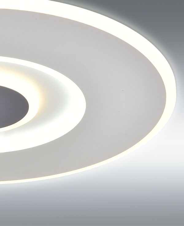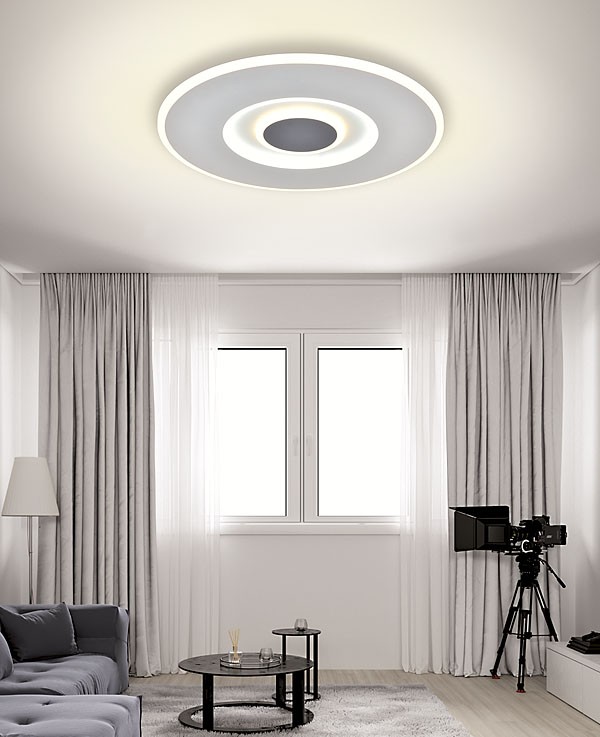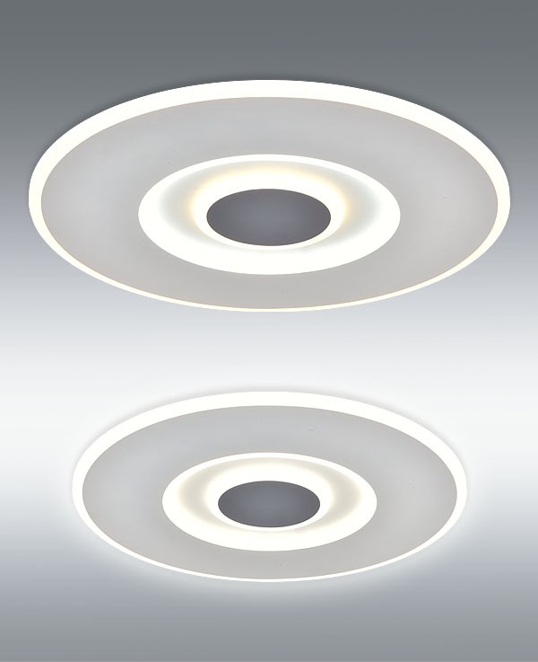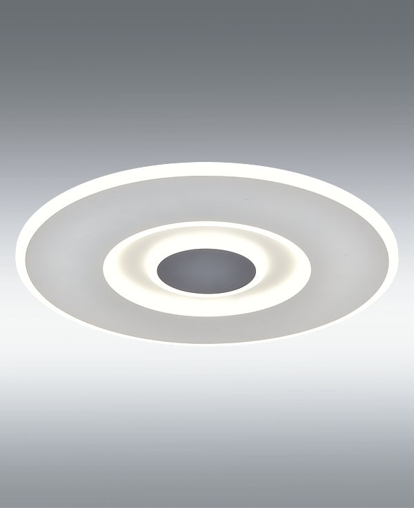 Lámpara plafón LED 70W 5000 lm. Mando a distancia control de intensidad y color CCT variable 4000K-3000K-6000K. Acabado blanco con el centro en gris plomo.