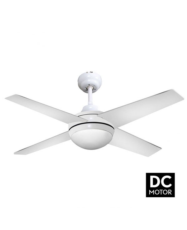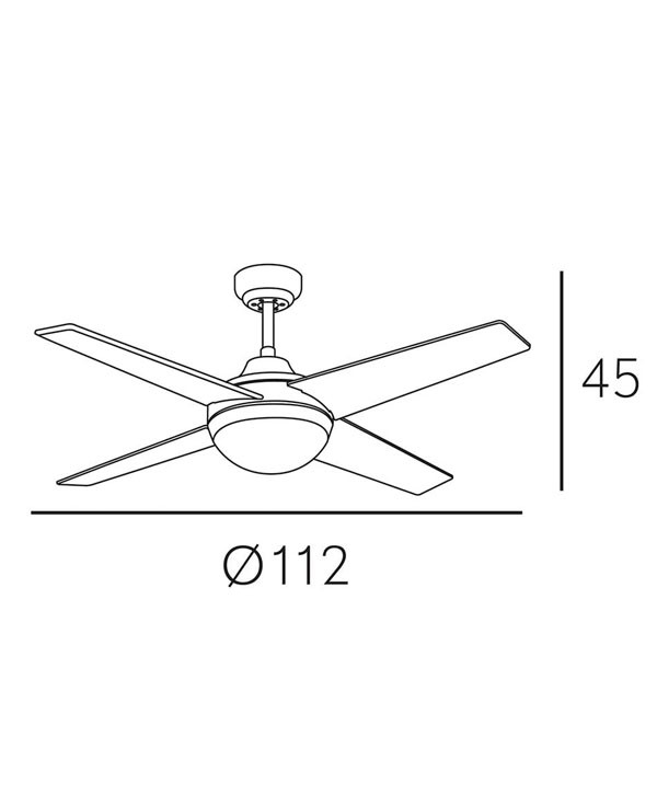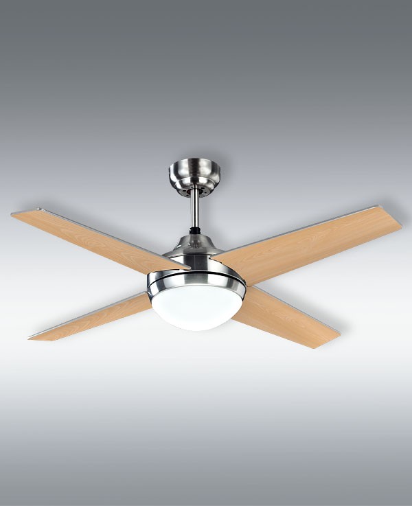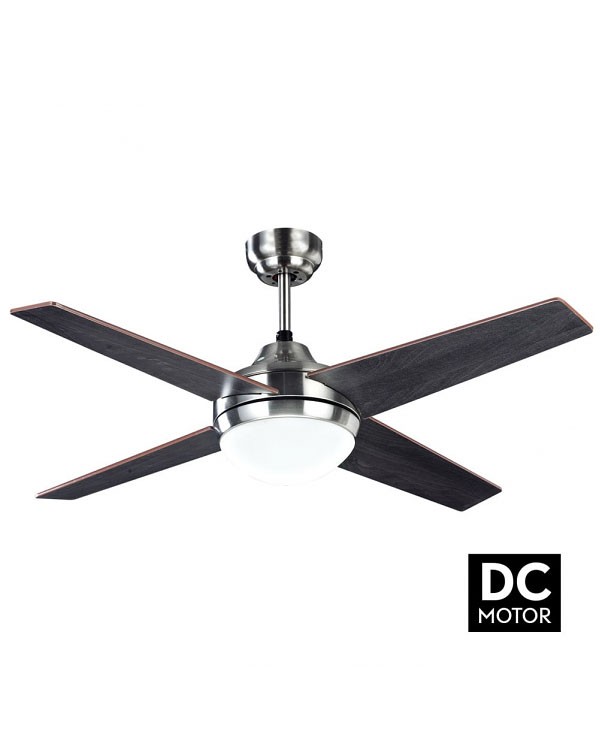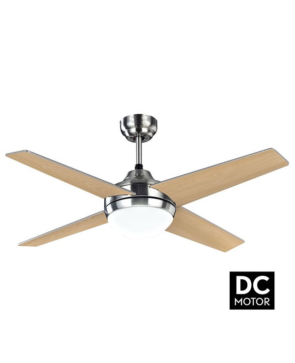 Ventilador CIRO realizado en metal, madera MDF y cristal, en color NIQUEL con cuatro aspas reversibles PLATA/HAYA. Motor DC. Tiene seis velocidades ajustables. Posee 2 portalámparas E27. Bombillas no incluidas. Su medida es de 112X112X45 centímetros. Control de aire verano o invierno. Mando a distancia incluido. Modelo también disponible en Níquel-Haya/Wengué, Blanco.