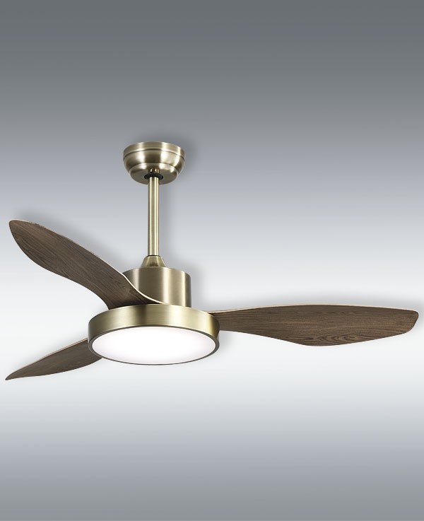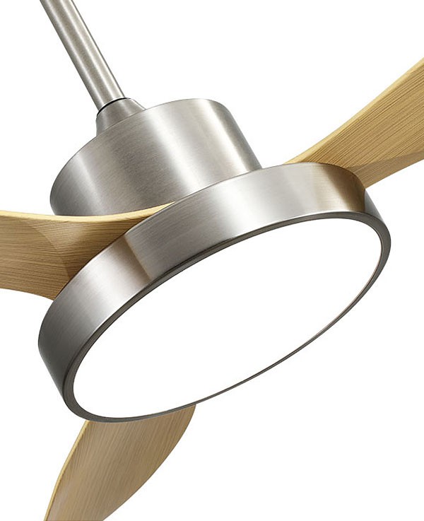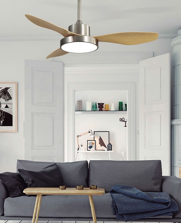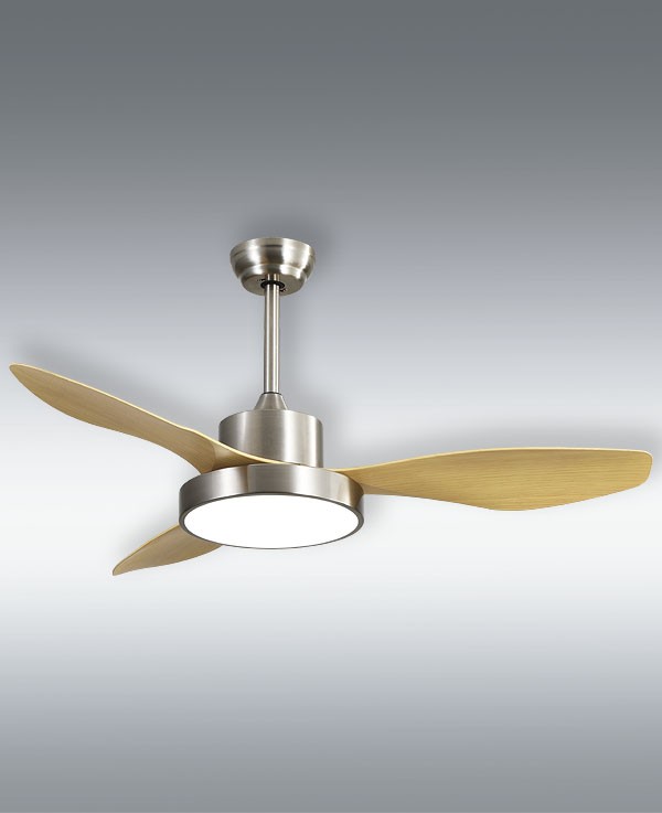 Ventilador HAYATE realizado en metal, madera y cristal, en color NIQUEL con TRES aspas de color HAYA. Tiene tres velocidades ajustables. Tecnología LED incorporada con una potencia de 40W, con 3 TEMPERATURAS DE LUZ( 3000-4000-6000K) y 3300 lúmenes. Su medida es de 120X120X39 centímetros. Control de aire verano o invierno. Mando a distancia INCLUIDO con MEMORIA DE COLOR incorporada y TEMPORIZADOR 1/2/4/8 H. Viene con dos medidas de Tija lo que permite adaptarlo para distintas alturas de techo. Modelo también disponible en Cuero-Roble y Blanco.